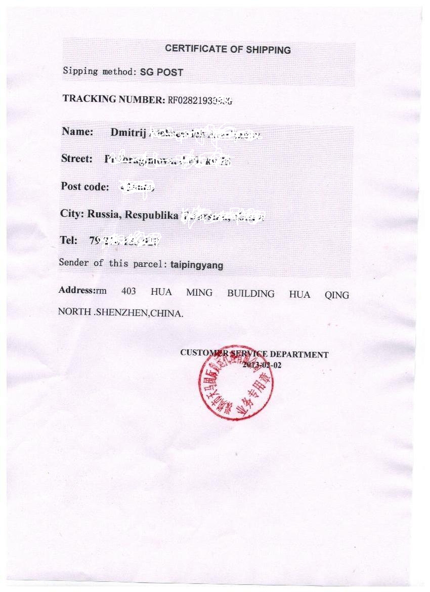 25 апреля 2012 г.Если Ваша посылка попала в Брянск, то нужно запастись железными нервами. Ни одна из посылок присланная из Китая или Гонконга мне или моим друзьям и прошедшая Брянскую таможню не была там меньше месяца. Там таможенники наверное тем и занимаются, что вскрывают их целыми днями, ища "очень подозрительные предметы". О чем свидетельствуют, через одну новости, на сайте российской таможни. Но вот о целосности вложений почему то не беспокоятся. С ужасом дума, что будет в очередной раз, месяц или полтора задержки.