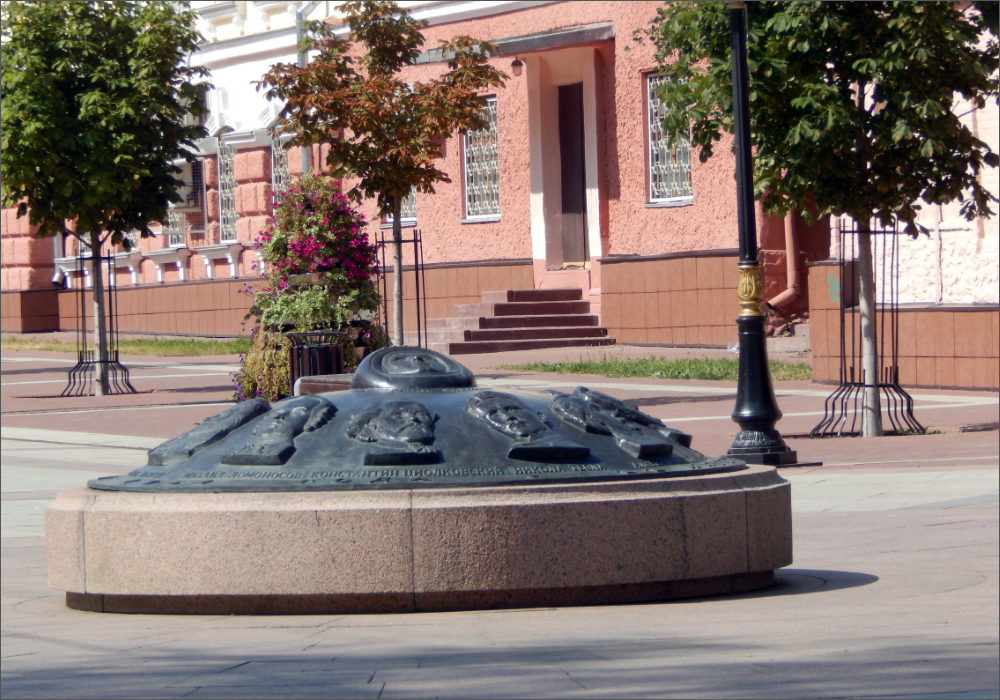 На перекрёстке Бульвара Гагарина и улицы Октябрьской в г. Брянске есть необычный памятник, точнее, памятный знак. Он представляет собой полусферу, на которой расположены барельефные портреты выдающихся основоположников космонавтики.